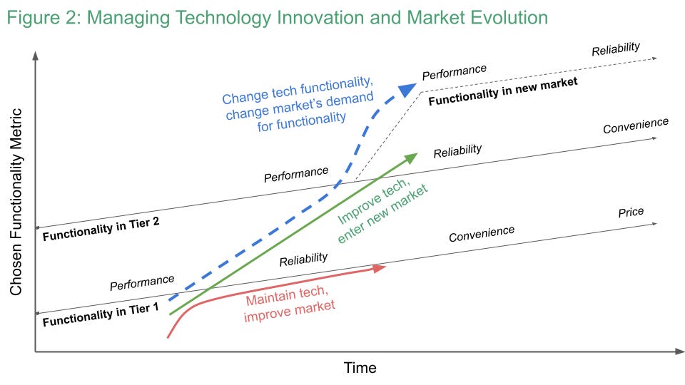 For each level of market performance demanded, value chains grow around the technology. Tech providers have 3 options: 1) Product performance can stagnate and its other market functionality demands can be improved. 2) Technology innovation can move the product upmarket to access customers with stricter performance demands. 3) The product’s performance can redefine functionality and enter/create a new type of market that’s inaccessible to former competitors.