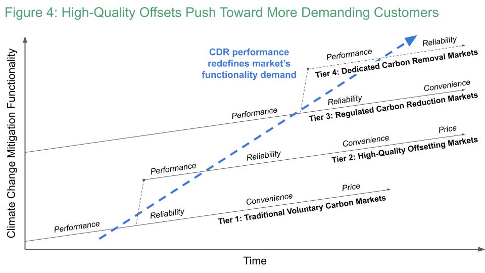 Putting this in context with The Innovator’s Dilemma, carbon offsets can leverage the voluntary carbon markets to improve Quality enough to be accepted into regulated carbon markets (Figure 3). High-quality offsets provide the only clear pathway to bridging the voluntary and regulated, compliance carbon markets. In other words, massive (gigaton-scale) market opportunities only exist for high-quality carbon offsets. Carbon removal technologies tend to be well-positioned to disrupt carbon offset markets because they offer credits with improved Quality.