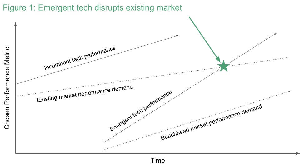 More specifically, the emergent tech tends to offer an advantage the incumbent tech cannot which enables success in the beachhead market.